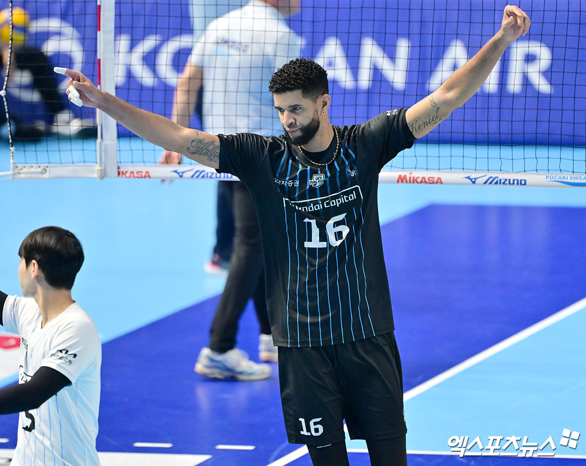 (엑스포츠뉴스 인천, 김한준 기자) 16일 오후 인천 계양체육관에서 열린 '진에어 2025-2026 V-리그' 대한항공과 현대캐피탈의 경기, 현대캐피탈 레오가 득점 후 기뻐하고 있다.