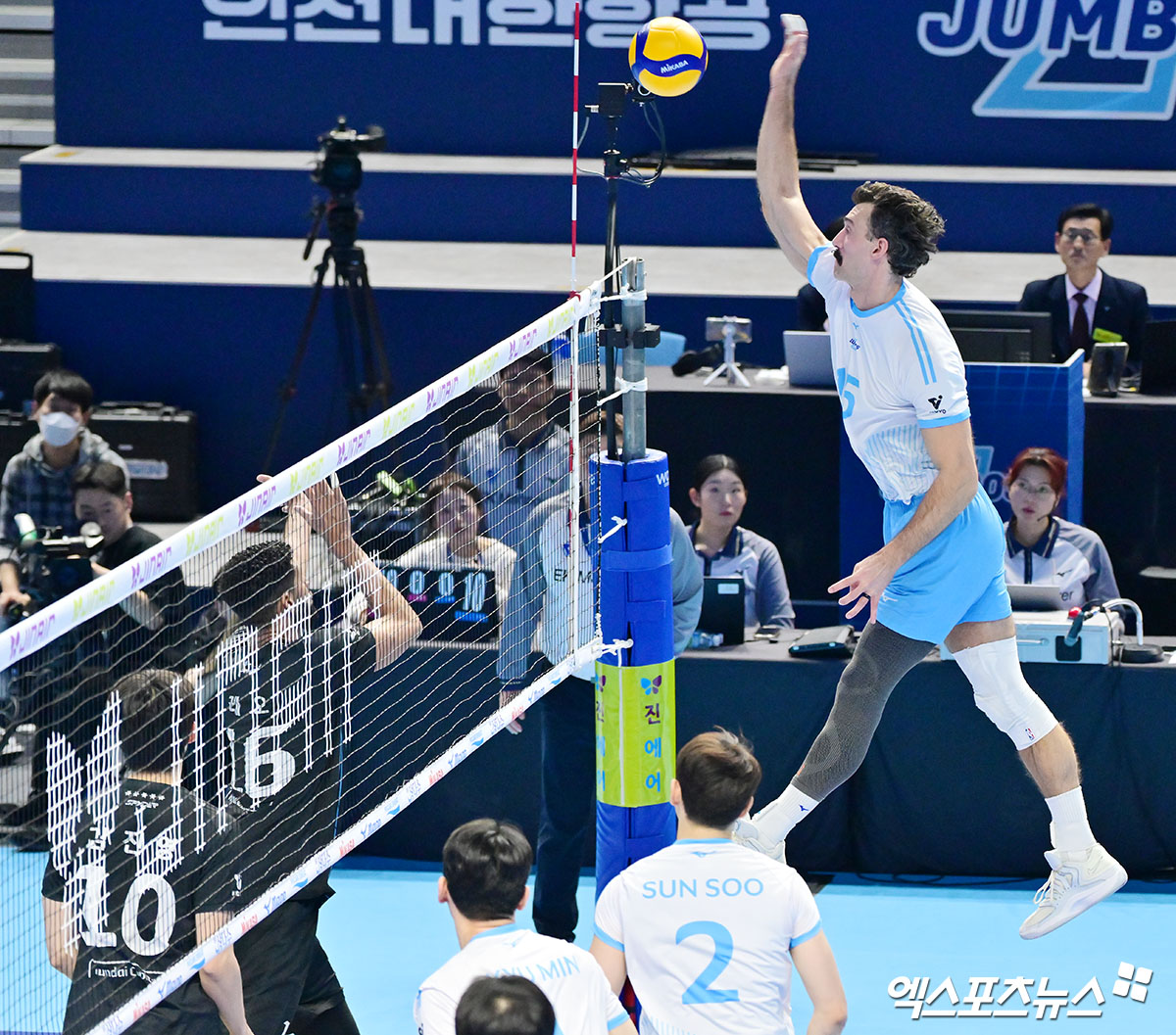 (엑스포츠뉴스 인천, 김한준 기자) 16일 오후 인천 계양체육관에서 열린 '진에어 2025-2026 V-리그' 대한항공과 현대캐피탈의 경기, 대한항공 러셀이 공격을 시도하고 있다.