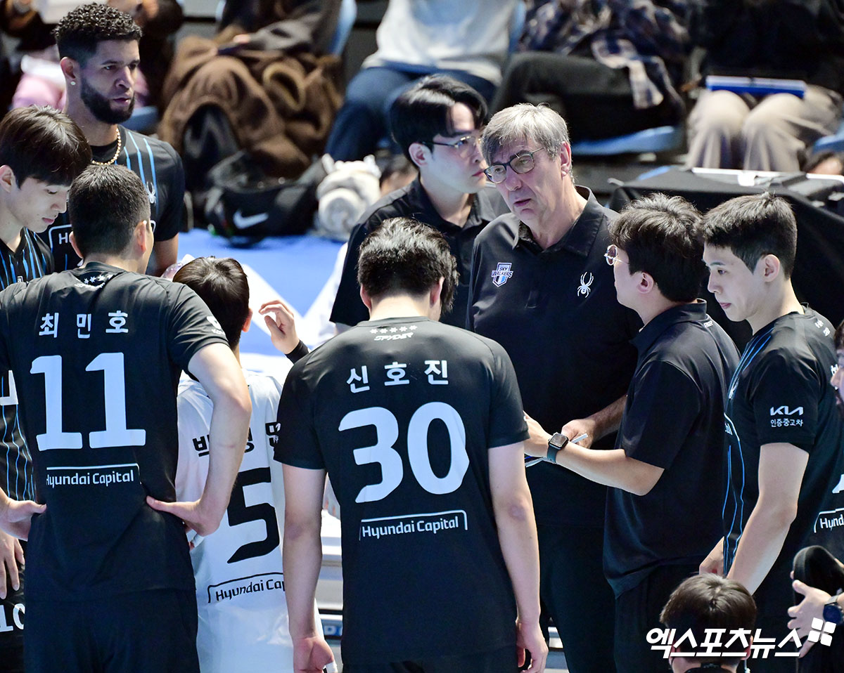 (엑스포츠뉴스 인천, 김한준 기자) 16일 오후 인천 계양체육관에서 열린 '진에어 2025-2026 V-리그' 대한항공과 현대캐피탈의 경기, 현대캐피탈 필립 블랑 감독이 작전타임을 갖고 있다.