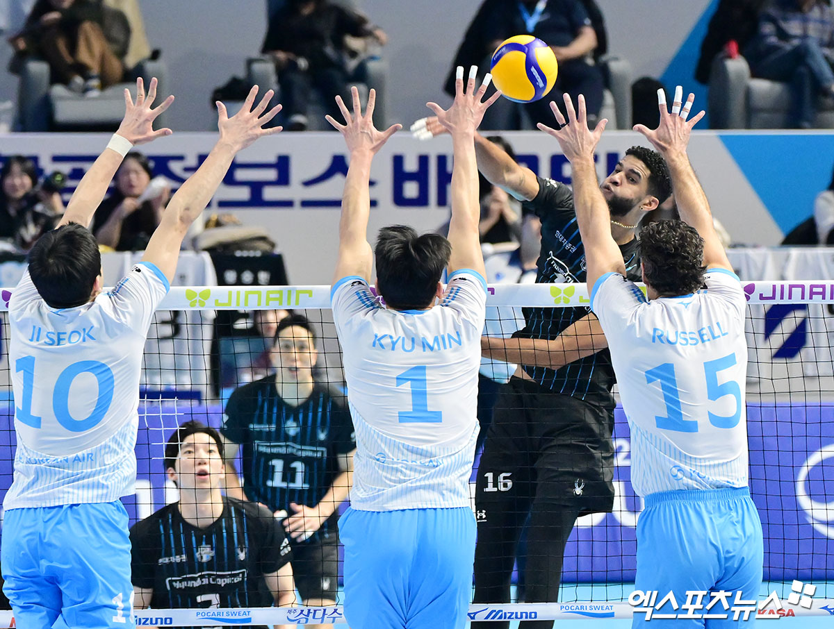 (엑스포츠뉴스 인천, 김한준 기자) 16일 오후 인천 계양체육관에서 열린 '진에어 2025-2026 V-리그' 대한항공과 현대캐피탈의 경기, 현대캐피탈 레오가 공격을 시도하고 있다.