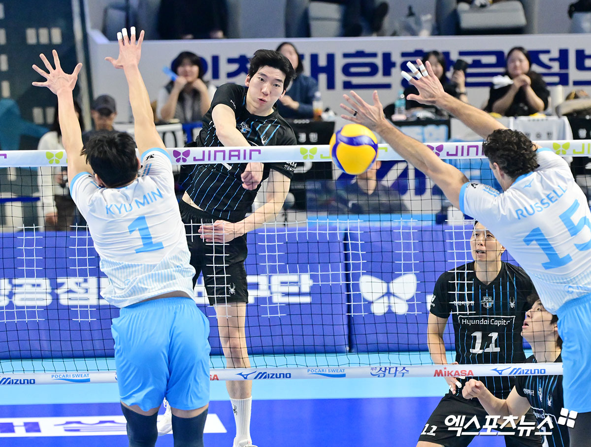 (엑스포츠뉴스 인천, 김한준 기자) 16일 오후 인천 계양체육관에서 열린 '진에어 2025-2026 V-리그' 대한항공과 현대캐피탈의 경기, 현대캐피탈 허수봉이 공격을 시도하고 있다.