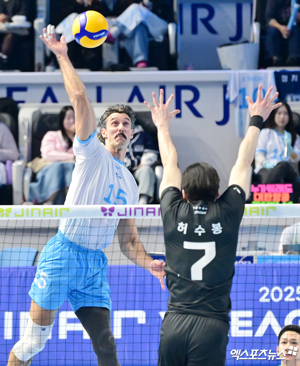 (엑스포츠뉴스 인천, 김한준 기자) 16일 오후 인천 계양체육관에서 열린 '진에어 2025-2026 V-리그' 대한항공과 현대캐피탈의 경기, 대한항공 러셀이 공격을 시도하고 있다.