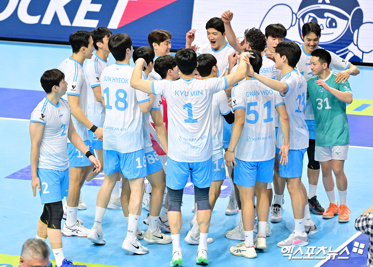 이날 경기에서 승리한 대한항공 선수들이 기뻐하고 있다.