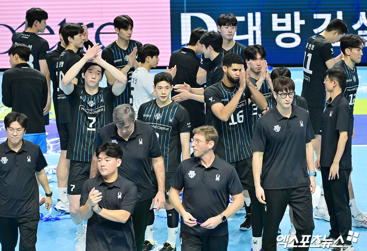 경기종료 후 현대캐피탈 선수들이 아쉬워하고 있다.