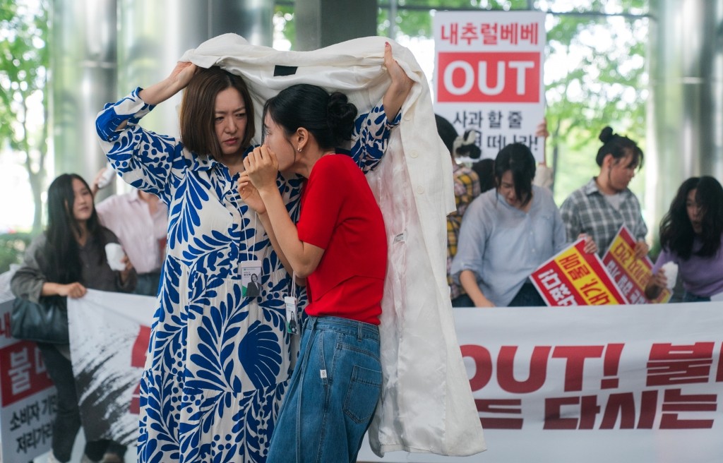 사진 속 고다림은 육아용품회사 내추럴베베 로비에서 수많은 사람들에 둘러싸여 있다. 사람들은 ‘내추럴베베 OUT’, ‘불매’ 등 충격적인 단어가 쓰인 플래카드와 피켓을 들고 시위 중이다. 사람들의 얼굴에 분노의 감정이 역력하다. 급기야 그들은 고다림에게 무언가를 던지기까지 하는 모습. 다음 사진에서는 고다림과 같은 마더TF팀의 장진희(정수영 분)가, 고다림을 지켜주기 위해 나타난 것으로 보인다.