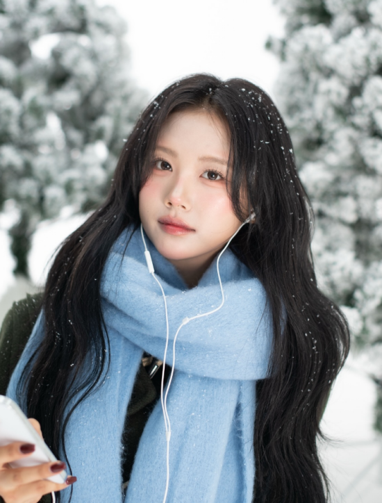 사진 속 재시는 하늘색 목도리를 두르고 귀에는 줄 이어폰을 꽂은 채로 아련한 표정을 짓고 있다.