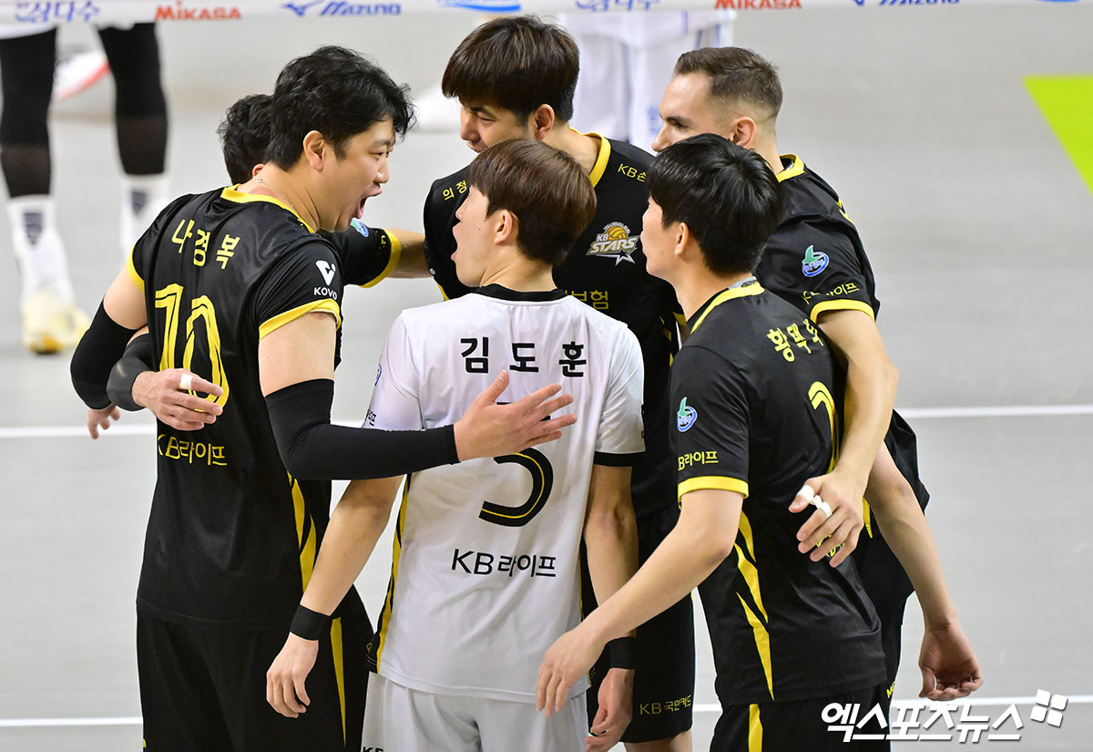 (엑스포츠뉴스 의정부, 김한준 기자) 18일 오후 경기도 의정부 경민대체육관에서 열린 '진에어 2025-2026 V-리그' KB손해보험과 삼성화재의 경기, KB손해보험 선수들이 득점 후 기뻐하고 있다.