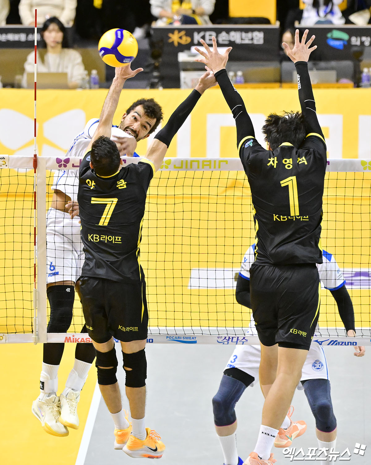 (엑스포츠뉴스 의정부, 김한준 기자) 18일 오후 경기도 의정부 경민대체육관에서 열린 '진에어 2025-2026 V-리그' KB손해보험과 삼성화재의 경기, 삼성화재 아히가 공격을 시도하고 있다.