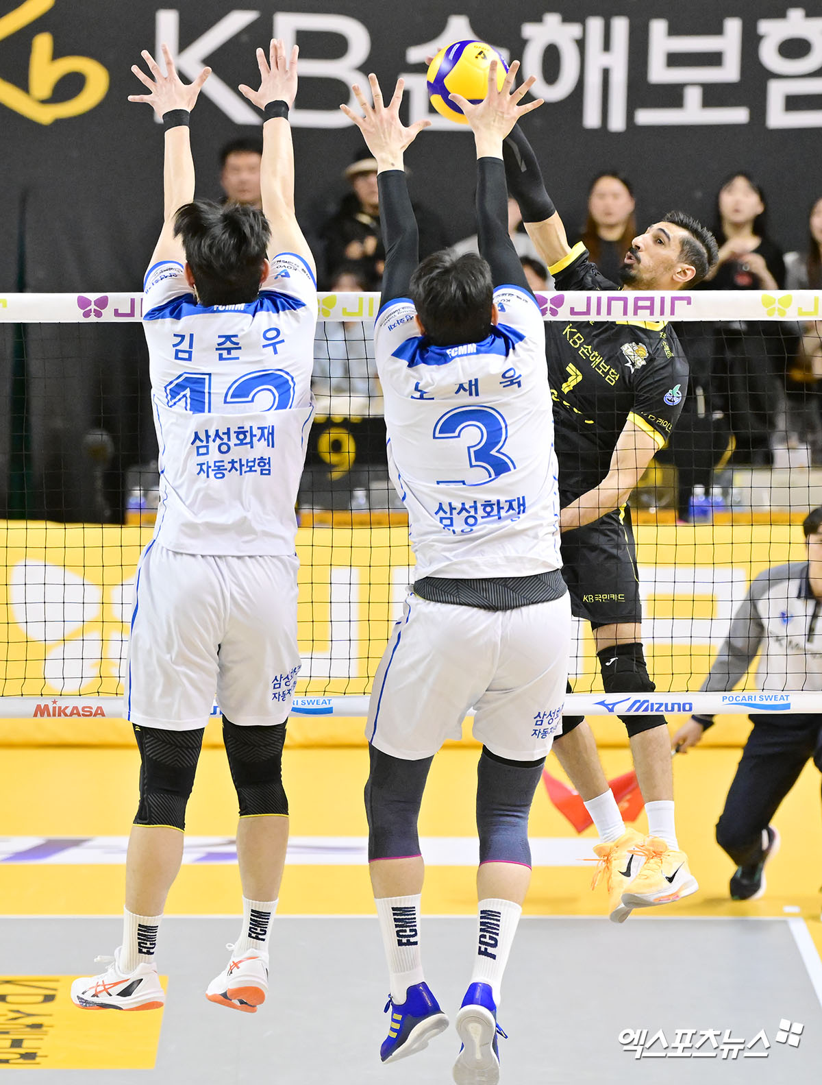 (엑스포츠뉴스 의정부, 김한준 기자) 18일 오후 경기도 의정부 경민대체육관에서 열린 '진에어 2025-2026 V-리그' KB손해보험과 삼성화재의 경기, KB손해보험 야쿱이 공격을 시도하고 있다.