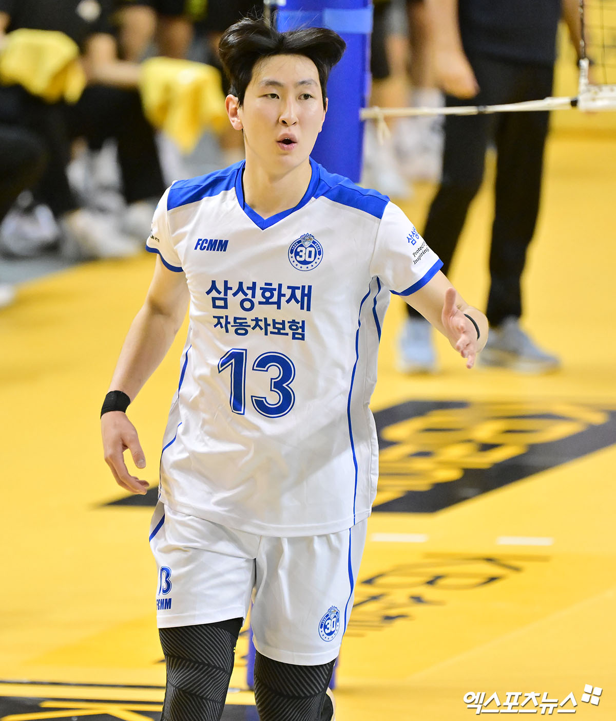 (엑스포츠뉴스 의정부, 김한준 기자) 18일 오후 경기도 의정부 경민대체육관에서 열린 '진에어 2025-2026 V-리그' KB손해보험과 삼성화재의 경기, 삼성화재 김준우가 블로킹 성공 후 기뻐하고 있다.
