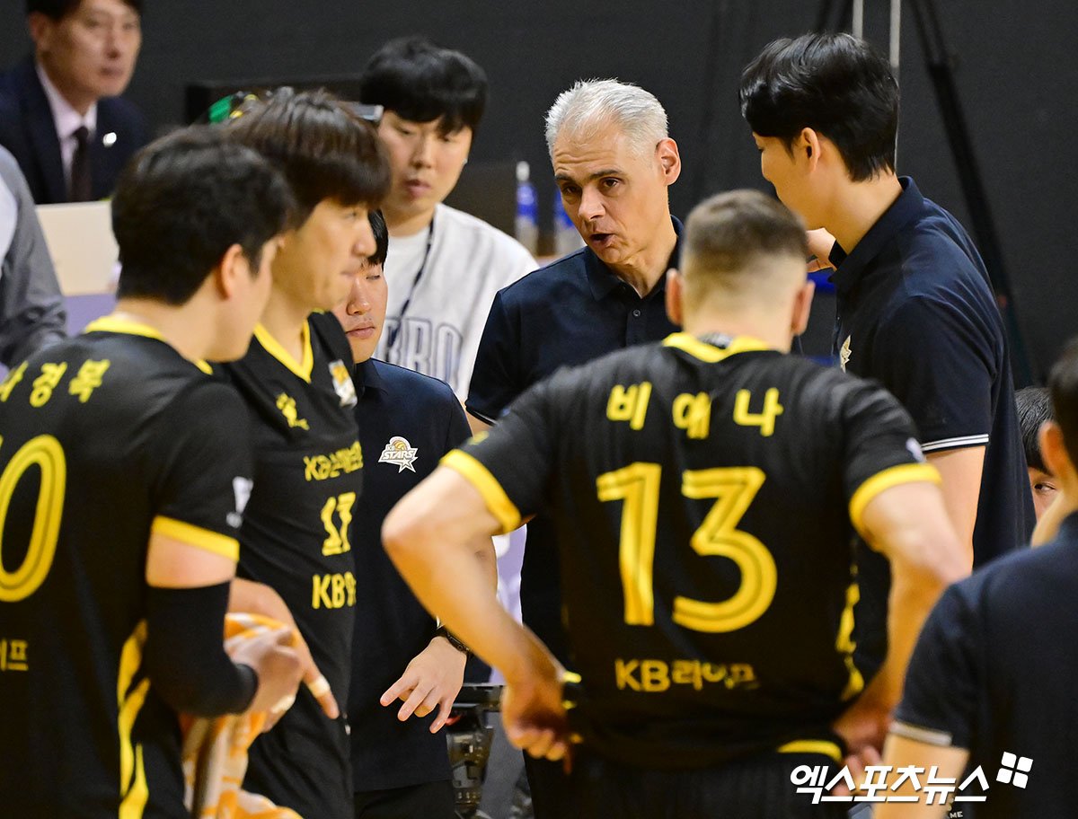 (엑스포츠뉴스 의정부, 김한준 기자) 18일 오후 경기도 의정부 경민대체육관에서 열린 '진에어 2025-2026 V-리그' KB손해보험과 삼성화재의 경기, KB손해보험 레오나르도 감독이 작전타임을 갖고 있다.