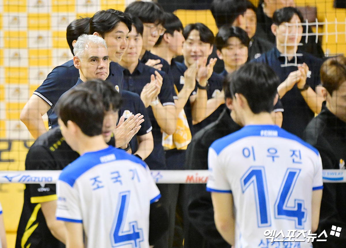 KB손해보험 레오나르도 감독이 박수를 치고 있다.