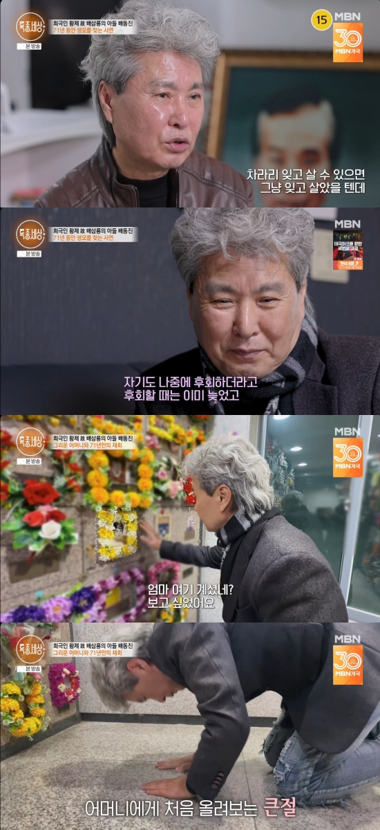 며칠 후 제작진에게 전화 한 통이 전해졌다. 배동진의 어머니의 손녀로부터 지난 2019, 2020년도에 돌아가셨다는 이야기를 들은 것. 이후 배동진은 71년 만에 어머니의 납골당에서 처음으로 어머니의 얼굴을 마주했다.