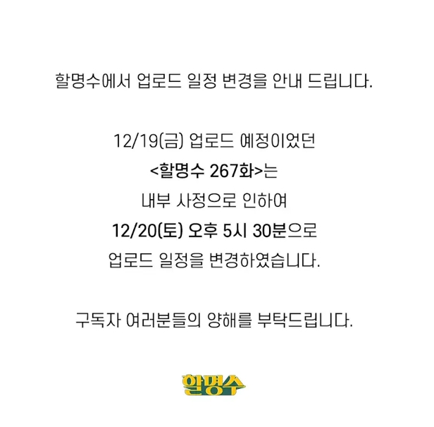 공지에 따르면 12월 19일(금) 업로드 예정이었던 '할명수 267화'는 내부 사정으로 인하여 12월 20일(토) 오후 5시 30분으로 업로드 일정을 변경했다.