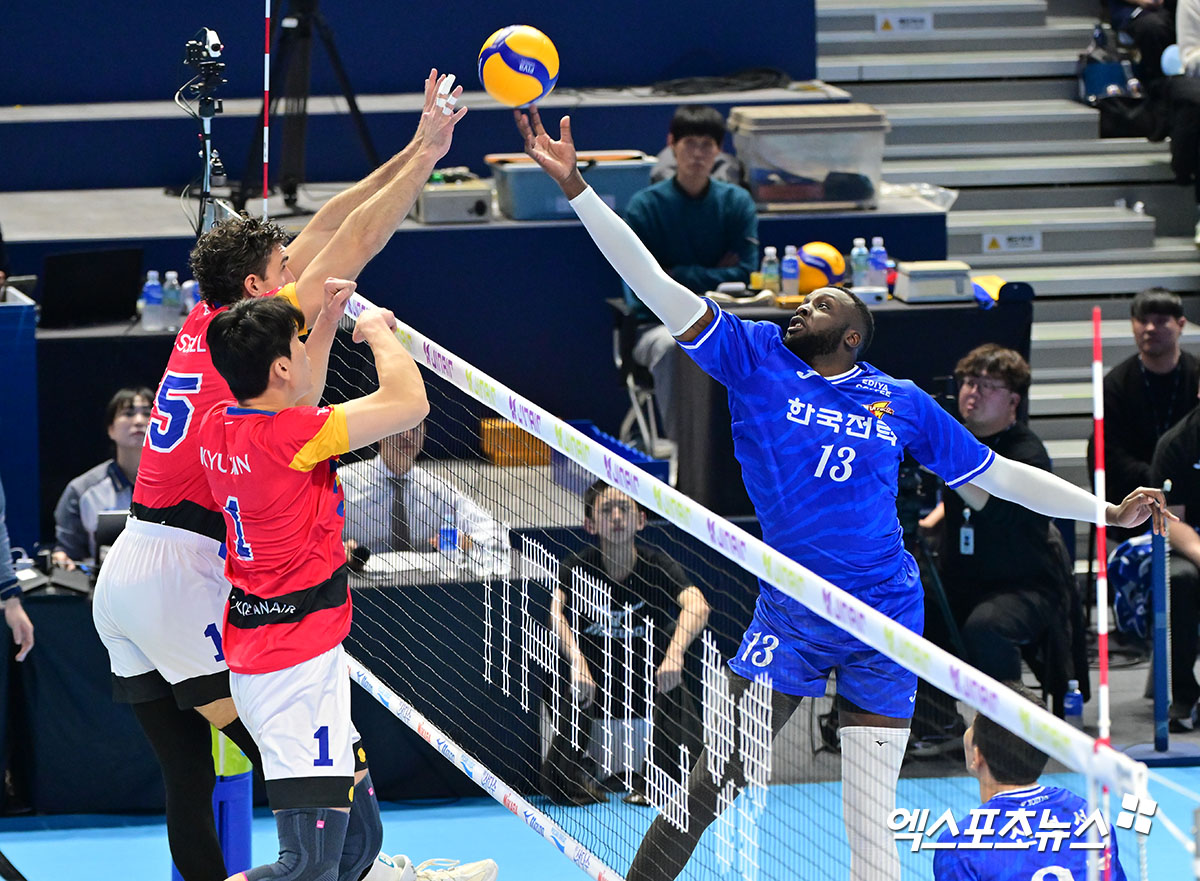 (엑스포츠뉴스 인천, 김한준 기자) 19일 오후 인천 계양체육관에서 열린 '진에어 2025-2026 V-리그' 대한항공과 한국전력의 경기, 한국전력 베논이 공격을 시도하고 있다.