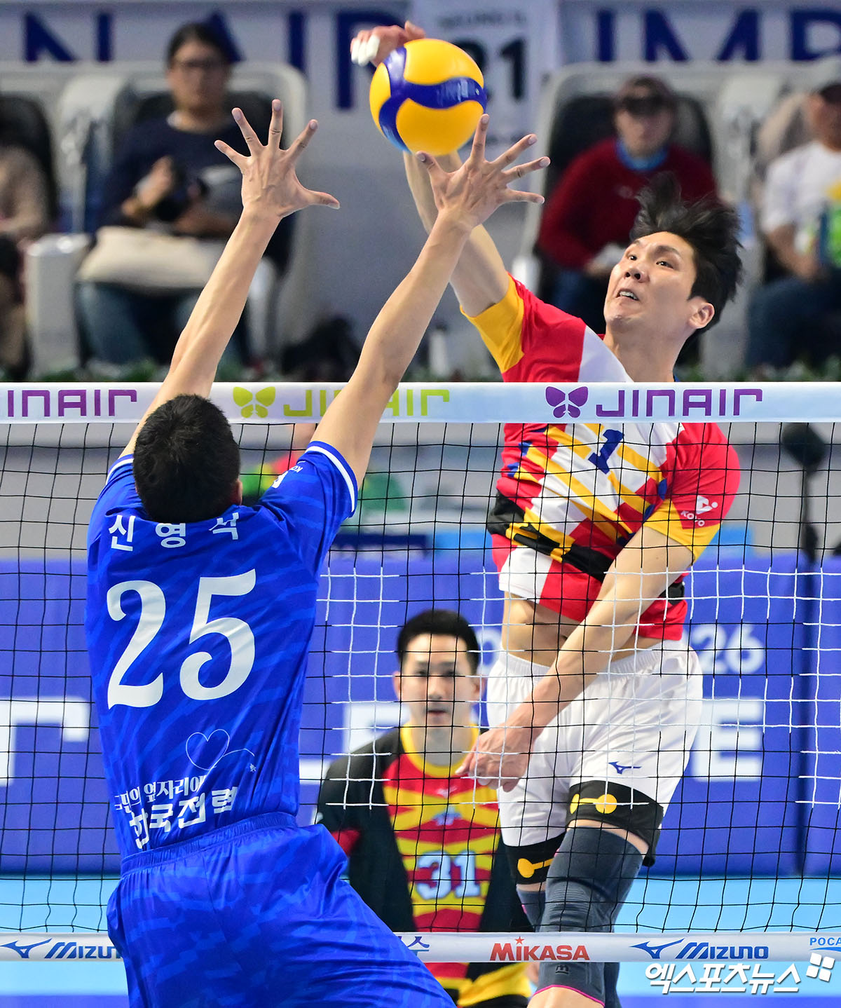 (엑스포츠뉴스 인천, 김한준 기자) 19일 오후 인천 계양체육관에서 열린 '진에어 2025-2026 V-리그' 대한항공과 한국전력의 경기, 대한항공 김규민이 공격을 시도하고 있다.