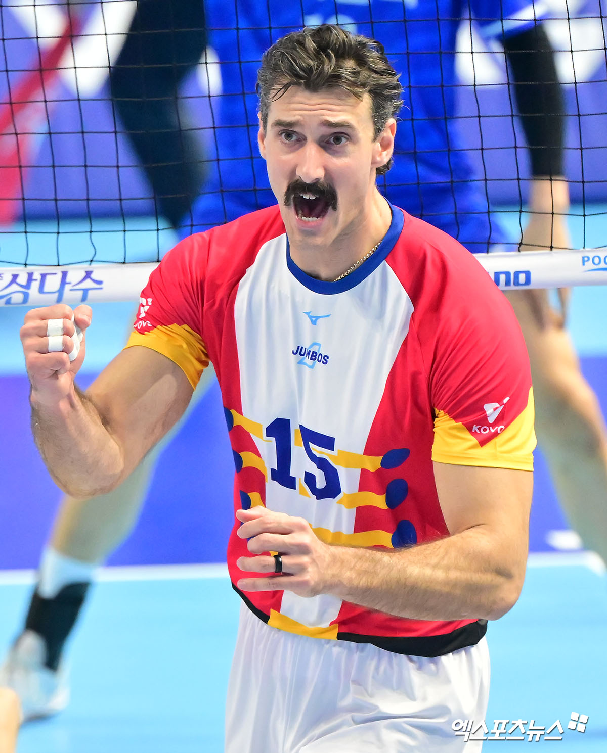 (엑스포츠뉴스 인천, 김한준 기자) 19일 오후 인천 계양체육관에서 열린 '진에어 2025-2026 V-리그' 대한항공과 한국전력의 경기, 대한항공 러셀이 득점 후 기뻐하고 있다.