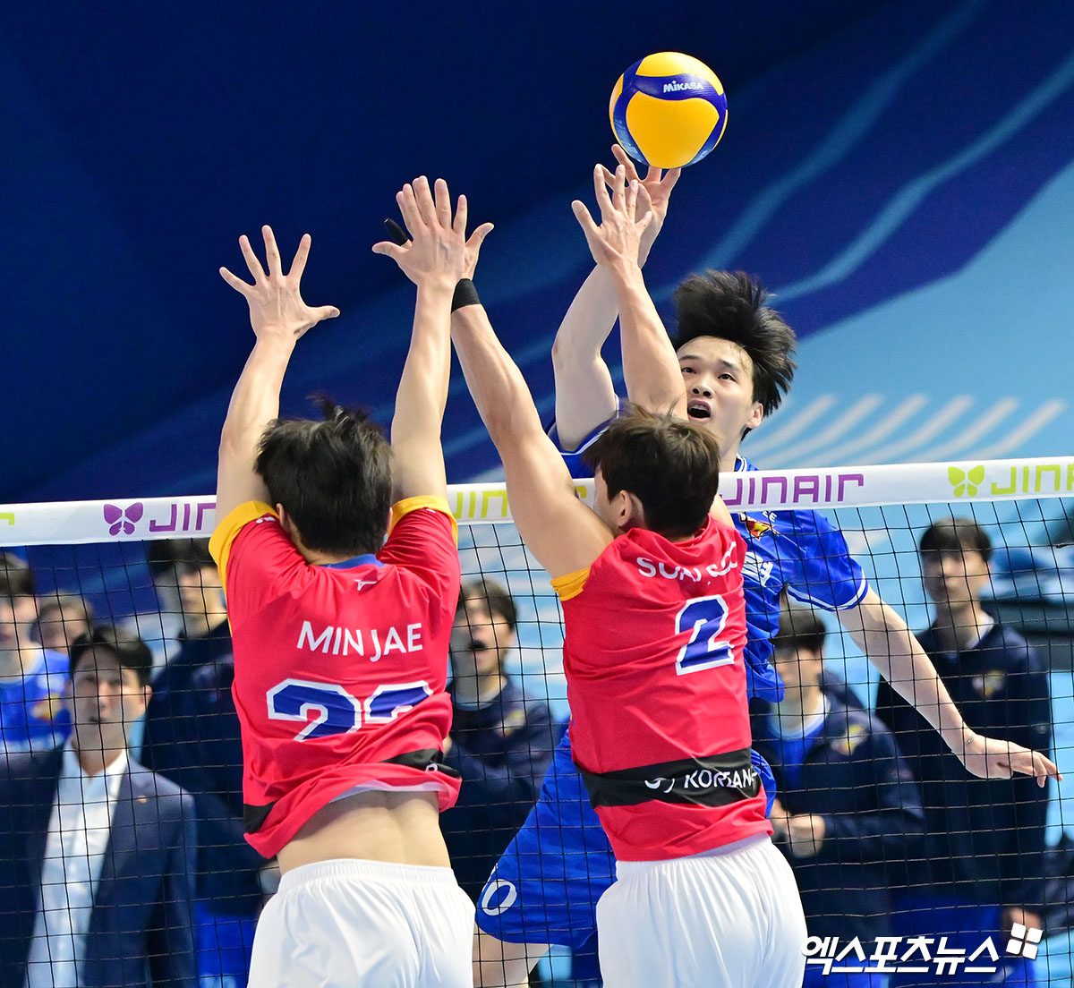 (엑스포츠뉴스 인천, 김한준 기자) 19일 오후 인천 계양체육관에서 열린 '진에어 2025-2026 V-리그' 대한항공과 한국전력의 경기, 한국전력 김정호가 공격을 시도하고 있다.