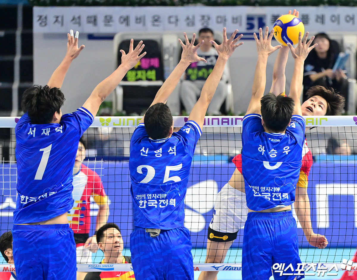 (엑스포츠뉴스 인천, 김한준 기자) 19일 오후 인천 계양체육관에서 열린 '진에어 2025-2026 V-리그' 대한항공과 한국전력의 경기, 대한항공 정한용이 공격을 시도하고 있다.