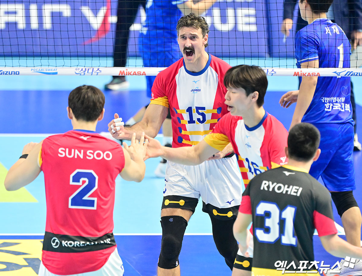 (엑스포츠뉴스 인천, 김한준 기자) 19일 오후 인천 계양체육관에서 열린 '진에어 2025-2026 V-리그' 대한항공과 한국전력의 경기, 대한항공 러셀이 득점 후 기뻐하고 있다.