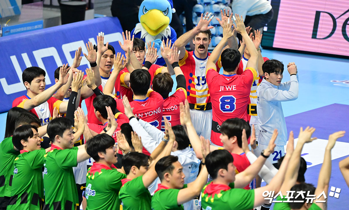 이날 경기에서 승리한 대한항공 선수들이 기뻐하고 있다.