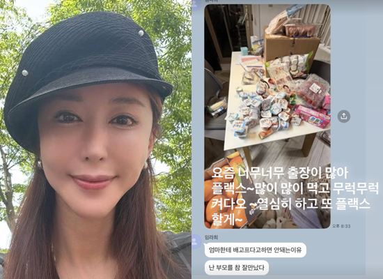공개한 사진은 딸에게서 받은 메시지 캡처본. 사진에 따르면 딸은 슈가 대량으로 주문해둔 요플레, 과일 등 간식류 사진을 슈에게 보내며 "엄마한테 배고프다고 하면 안 되는 이유. 난부모를 참 잘 만났다"고 말해 슈를 흐뭇하게 만들었다.