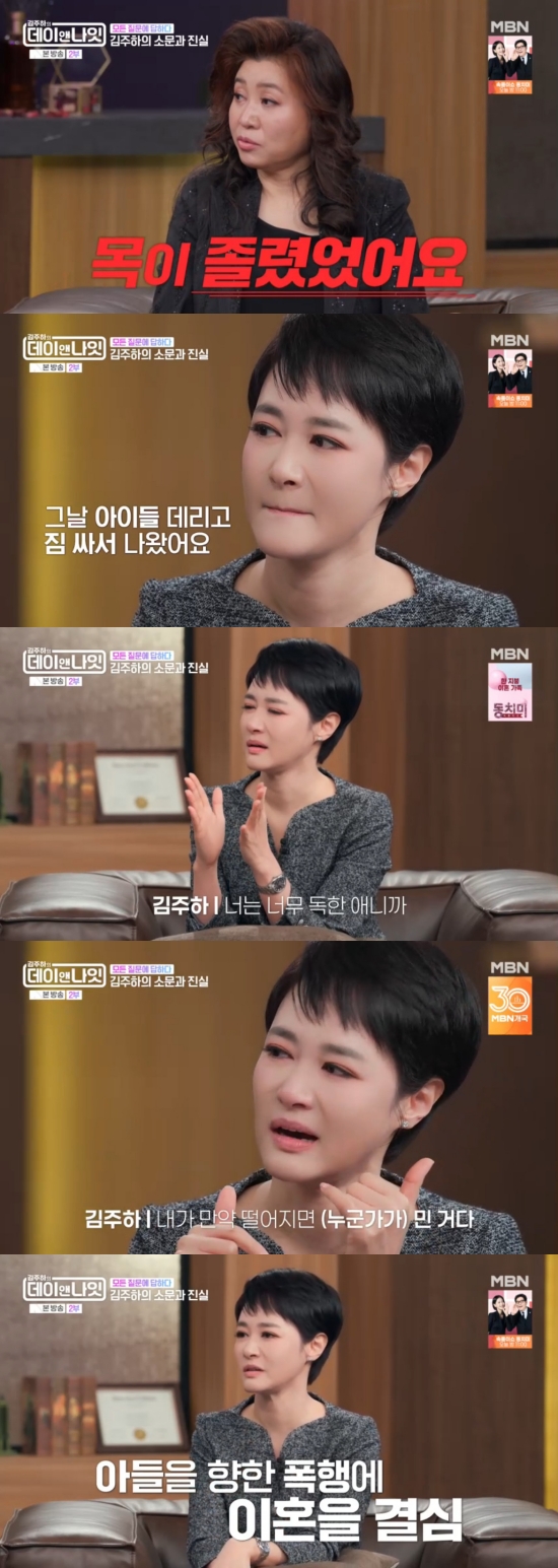 이어 "주하는 기억하는지 모르겠는데 이혼으로 가는 과정이 최악으로 치달았을 때는 (주하의) 목이 졸렸다. 죽을 뻔했다"고 밝혔다. 김주하는 "(목이 졸린 날) 그날 짐을 싸서 아이들을 데리고 나왔다"고 고개를 끄덕였다.