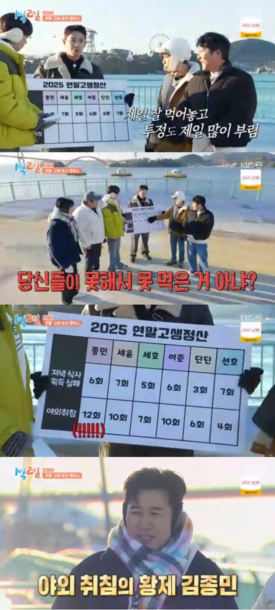 야외취침의 왕은 김종민으로 밝혀졌다. 주종현PD는 김종민이 24번의 여행 중 12번이나 밖에서 잤다고 말했다.