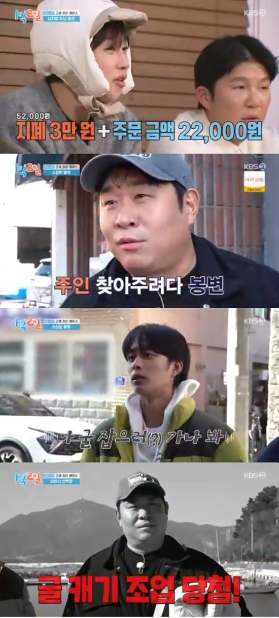 유선호는 문세윤과 마찬가지로 그대로 끌려갔다. 두 사람은 굴섬으로 낙오되어 굴 수확에 나섰다.