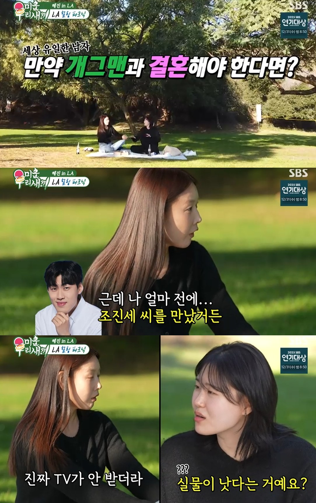 이어 한혜진은 "(조진세가) 진짜 TV 화면이 안 받더라. 실물이 훨씬 낫더라. 피부도 엄청 좋고 착하시더라"고 실물 후기를 밝혔다.