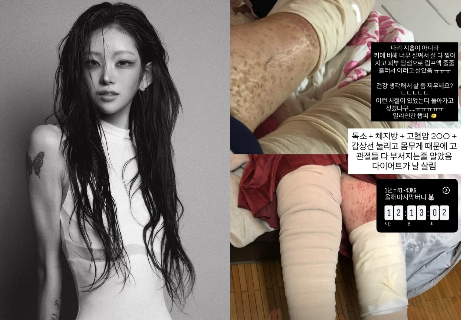 그는 "키에 비해 너무 살쪄서 살 다 찢어지고 피부 땀샘으로 림프액 줄줄 흘러서 이러고 살았음"이라며 당시 다리 사진을 공개했다.