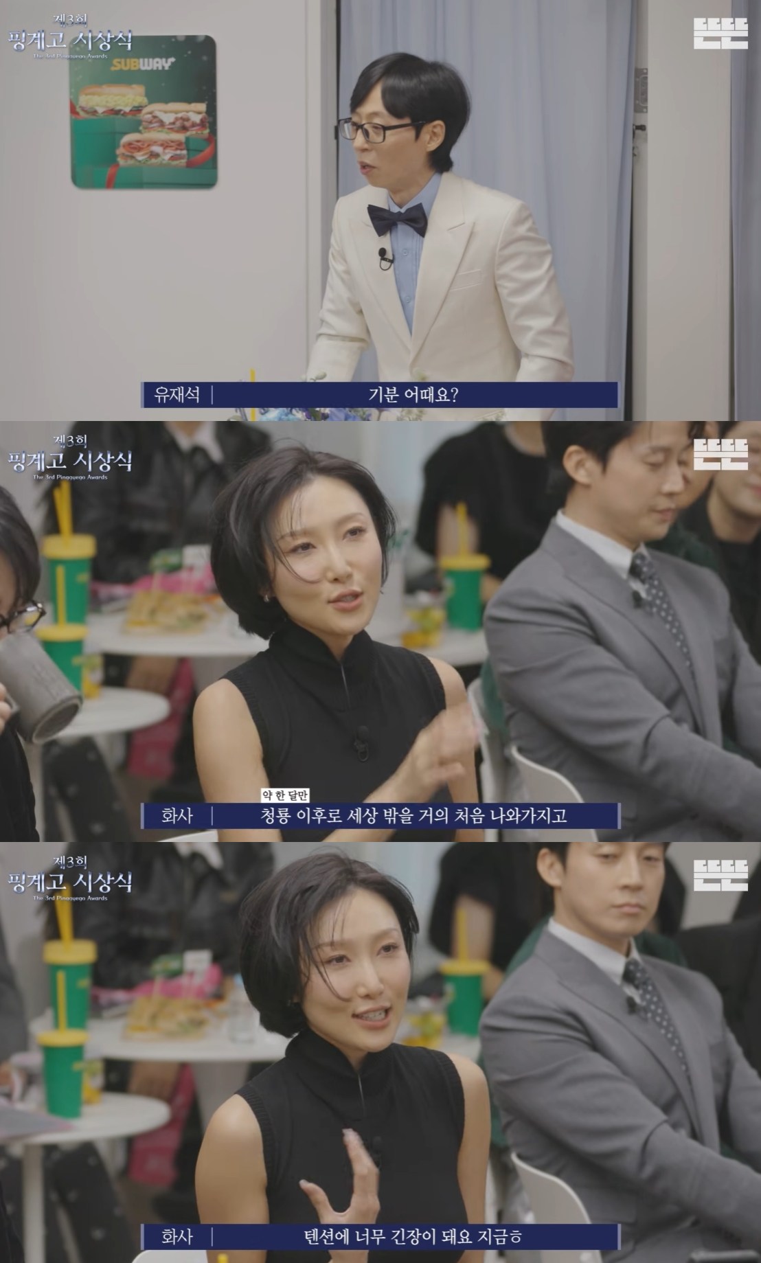 21일 유튜브 '뜬뜬' 채널을 통해 제3회 핑계고 시상식이 열렸다. 이날 현장에는 황정민, 하하, 고경표, 지예은, 우즈, 화사, 송은이, 이광수, 양세찬, 지석진 등이 참석해 현장 분위기를 달궜다.