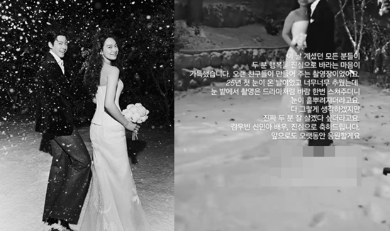 그러면서 "25년 첫 눈이 온 날이었고 너무너무 추웠는데 눈 밭에서 촬영은 드라마처럼 한번 스쳐주더니 눈이 흩뿌려지더라"라며 공개된 김우빈, 신민아의 웨딩 화보 속 눈이 진짜 눈임을 공개했다.