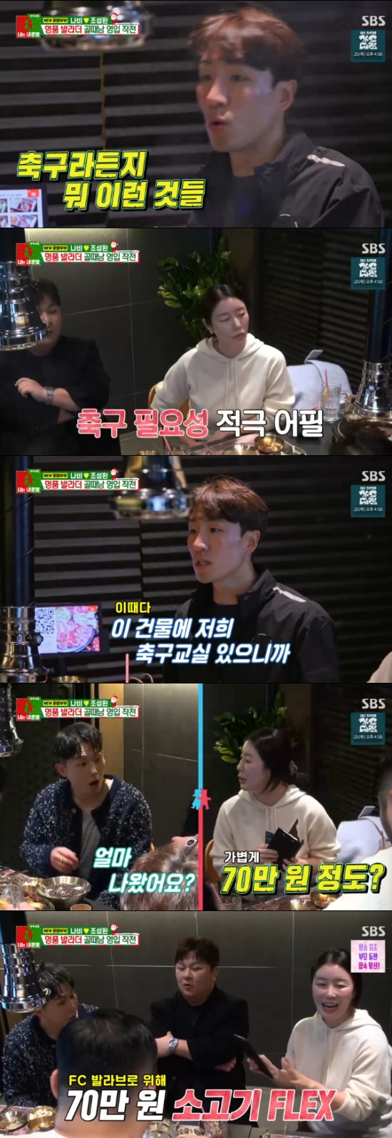 그러자 조성환은 "이 건물에 저희 축구교실 있으니까, 구경 한번 하세요"라면서 바로 축구교실로 안내했다. 나비는 "계산은 내가 할게. 가볍게 70만원 정도 나왔다. 괜찮다. 스타들을 모셨는데..."라고 생색을 냈다. 이어 나비는 "저분들이 또 아이들이 있으니까. 장기적으로 봐야한다"고 야망을 드러냈다.