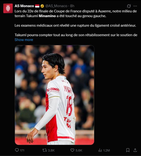 AS모나코 구단은 22일 공식 발표를 통해 "프랑스컵 경기 도중 미드필더 미나미노 다쿠미가 왼쪽 무릎을 부상당했으며, 검사 결과 전방십자인대 파열로 진단됐다"고 밝혔다.