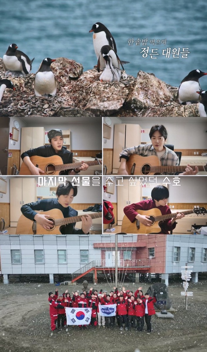 남극에 들어온 뒤 고된 주방일을 마치고도 수호는 월동대원들의 이야기를 엮은 자작곡 ‘남극에서 온 편지(I’ll be here)’를 만들었다..