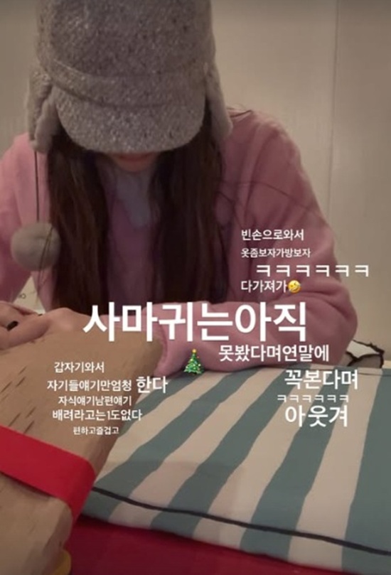 23일 고현정은 자신의 SNS에 "빈 손으로 와서 옷 좀 보자, 가방 보자 다 가져가. 갑자기 와서 자기들 이야기만 엄청 한다. 자식 이야기, 남편 이야기, 배려라고는 1도 없다. '사마귀'는 아직 못 봤다고 연말에 꼭 본다며. 아 웃겨. 편하고 즐겁고. 고마운 친구들, 내 친구들"이라는 글과 함께 사진을 게재했다.