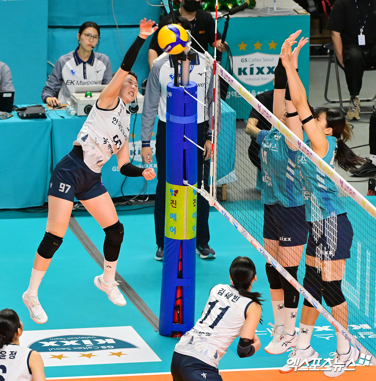 (엑스포츠뉴스 장충, 김한준 기자) 23일 오후 서울 장충체육관에서 열린 '진에어 2025-2026 V-리그' GS칼텍스와 한국도로공사의 경기, 도로공사 강소휘가 공격을 시도하고 있다.