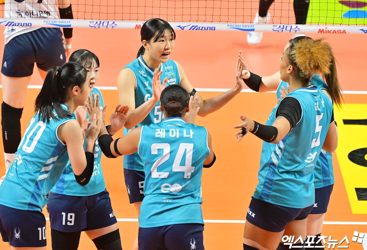 (엑스포츠뉴스 장충, 김한준 기자) 23일 오후 서울 장충체육관에서 열린 '진에어 2025-2026 V-리그' GS칼텍스와 한국도로공사의 경기, GS칼텍스 오세연이 득점 후 기뻐하고 있다.