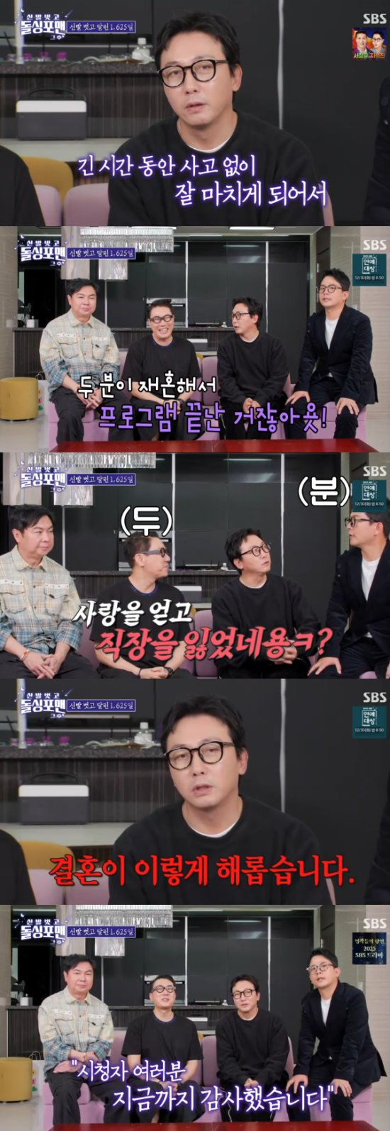 김준호는 "저희가 4년 넘게 달렸는데, 그래도 절반은 행복을 찾았잖아요?"라면서 탁재훈을 바라봤고, 탁재훈은 "두 분(이상민, 김준호)이 재혼을 해서 프로그램이 끝나는 거잖아요!"라면서 원망했다.