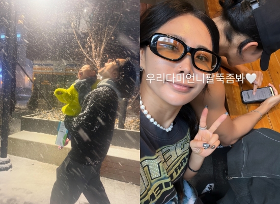 또 다른 사진에서는 눈 내리는 밤, 정담이 딸을 품에 안은 채 눈을 맞으며 웃고 있는 모습이 담겨 훈훈함을 더했다. 겨울 점퍼를 입은 딸은 눈을 바라보며 천진난만한 표정을 지어 보는 이들의 미소를 자아낸다. 이어 공개된 실내 사진에서도 앙증맞은 딸의 모습이 담기며 러블리 가족의 면모를 뽐냈다.