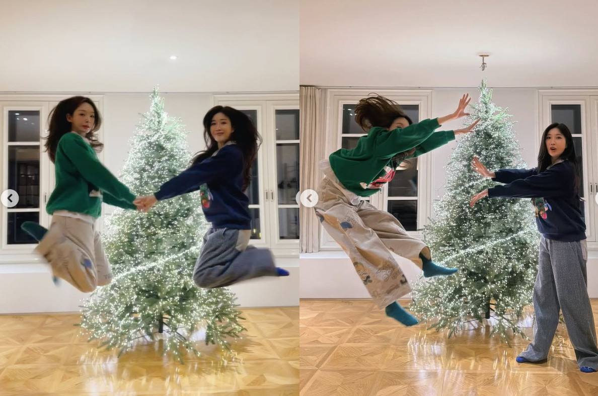 공개된 사진 속 강민경은 이해리와 함께 크리스마스를 맞아 기념샷을 찍고 있는 모습이다. 손하트부터 포옹을 하거나 점프샷까지 다채로운 포즈를 취하고 있어 시선을 모았다.