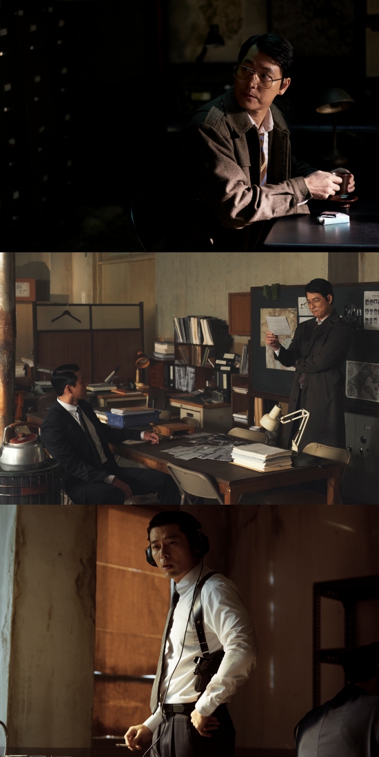 반면, ‘백기태’와 정면으로 맞서는 검사 장건영은 백기태의 스틸과는 전혀 다른 온도의 장면을 보여준다. 큰 안경과 투박한 코트 차림이 그의 캐릭터를 대변하며 존재감을 각인시킨다. 그리고 두 인물의 대면을 순간 포착한 장면에서, 그 차이점은 극대화되며 숨 막히는 긴장감을 전한다. 부와 권력의 정점을 노리며 이중생활을 감행하는 백기태와 범죄 카르텔의 실체 앞에서 그를 마주한 장건영. 두 인물이 처음으로 정면 충돌하는 순간은 욕망과 욕망이 맞부딪히는 격렬한 대립의 서막을 연다.