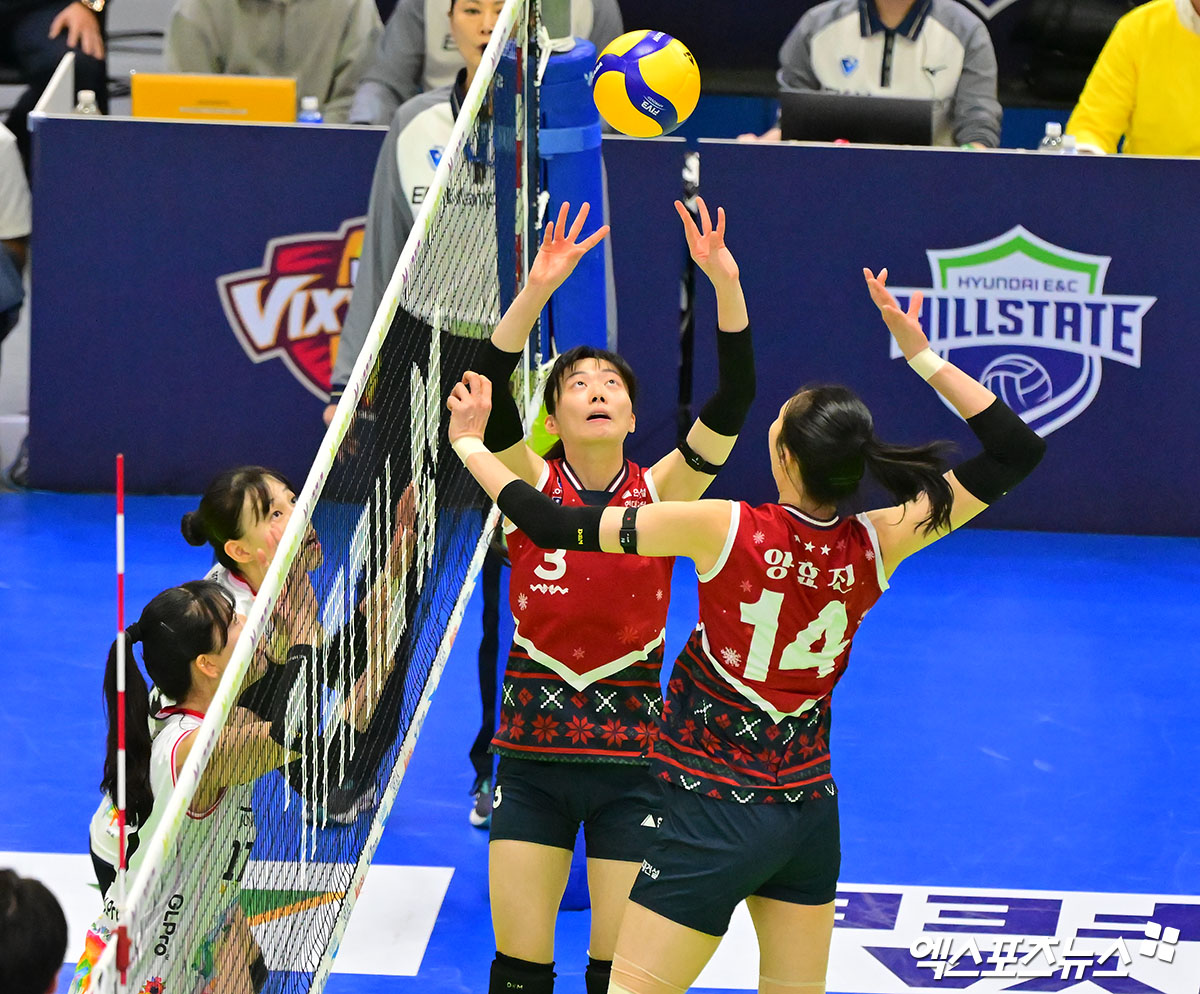 (엑스포츠뉴스 수원, 김한준 기자) 25일 오후 경기도 수원실내체육관에서 열린 '진에어 2025-2026 V-리그' 현대건설과 정관장의 경기, 현대건설 김다인이 토스를 하고 있다.