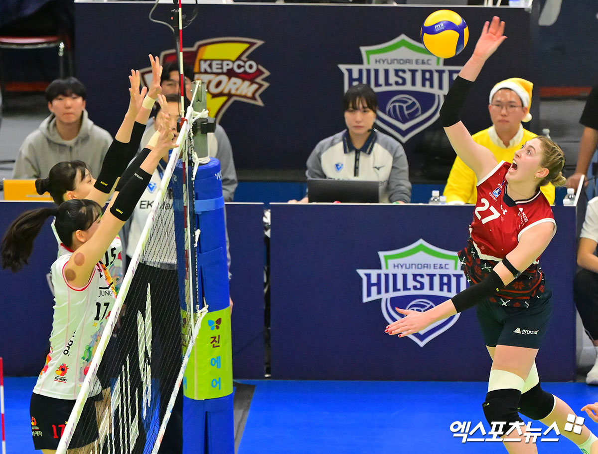 (엑스포츠뉴스 수원, 김한준 기자) 25일 오후 경기도 수원실내체육관에서 열린 '진에어 2025-2026 V-리그' 현대건설과 정관장의 경기, 현대건설 카리가 공격을 시도하고 있다.