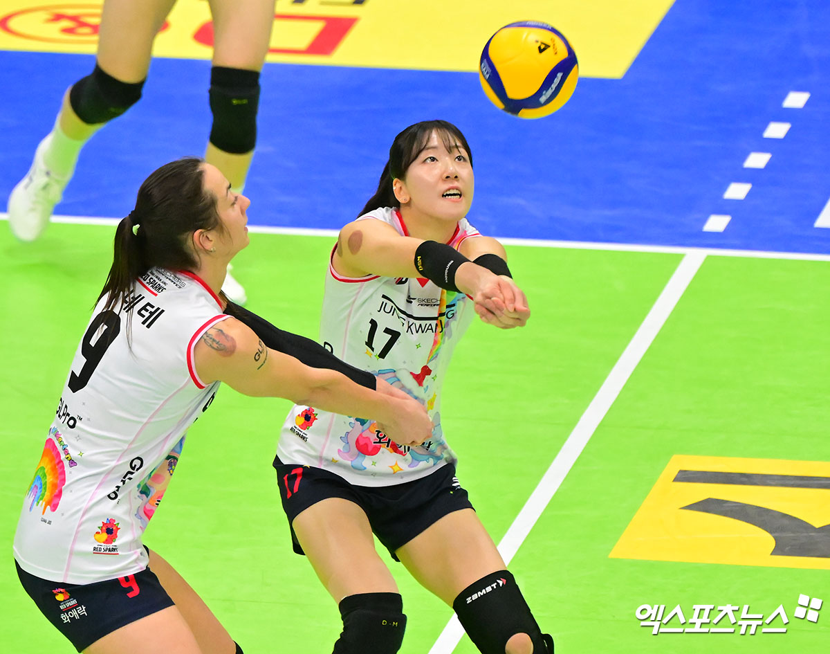 (엑스포츠뉴스 수원, 김한준 기자) 25일 오후 경기도 수원실내체육관에서 열린 '진에어 2025-2026 V-리그' 현대건설과 정관장의 경기, 정관장 정호영이 디그를 하고 있다.