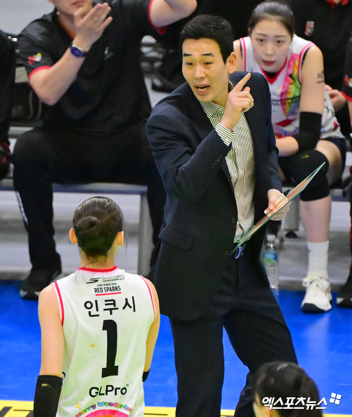 (엑스포츠뉴스 수원, 김한준 기자) 25일 오후 경기도 수원실내체육관에서 열린 '진에어 2025-2026 V-리그' 현대건설과 정관장의 경기, 정관장 고희진 감독이 인쿠시에게 지시를 하고 있다.