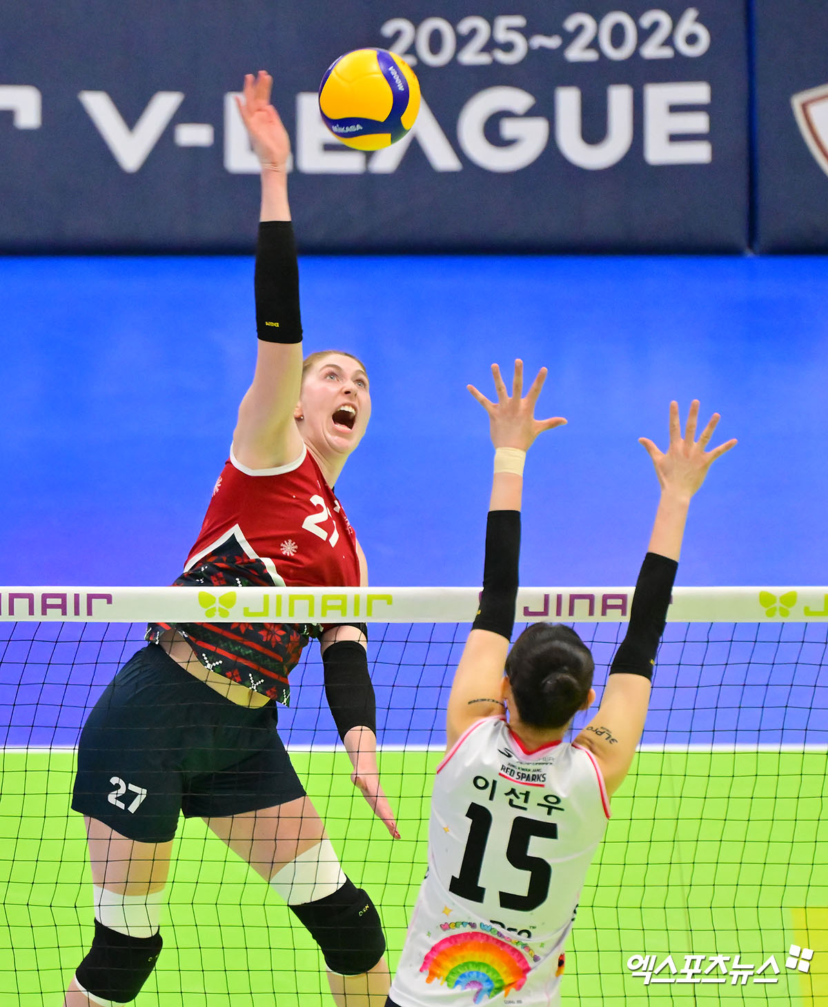 (엑스포츠뉴스 수원, 김한준 기자) 25일 오후 경기도 수원실내체육관에서 열린 '진에어 2025-2026 V-리그' 현대건설과 정관장의 경기, 현대건설 카리가 공격을 시도하고 있다.