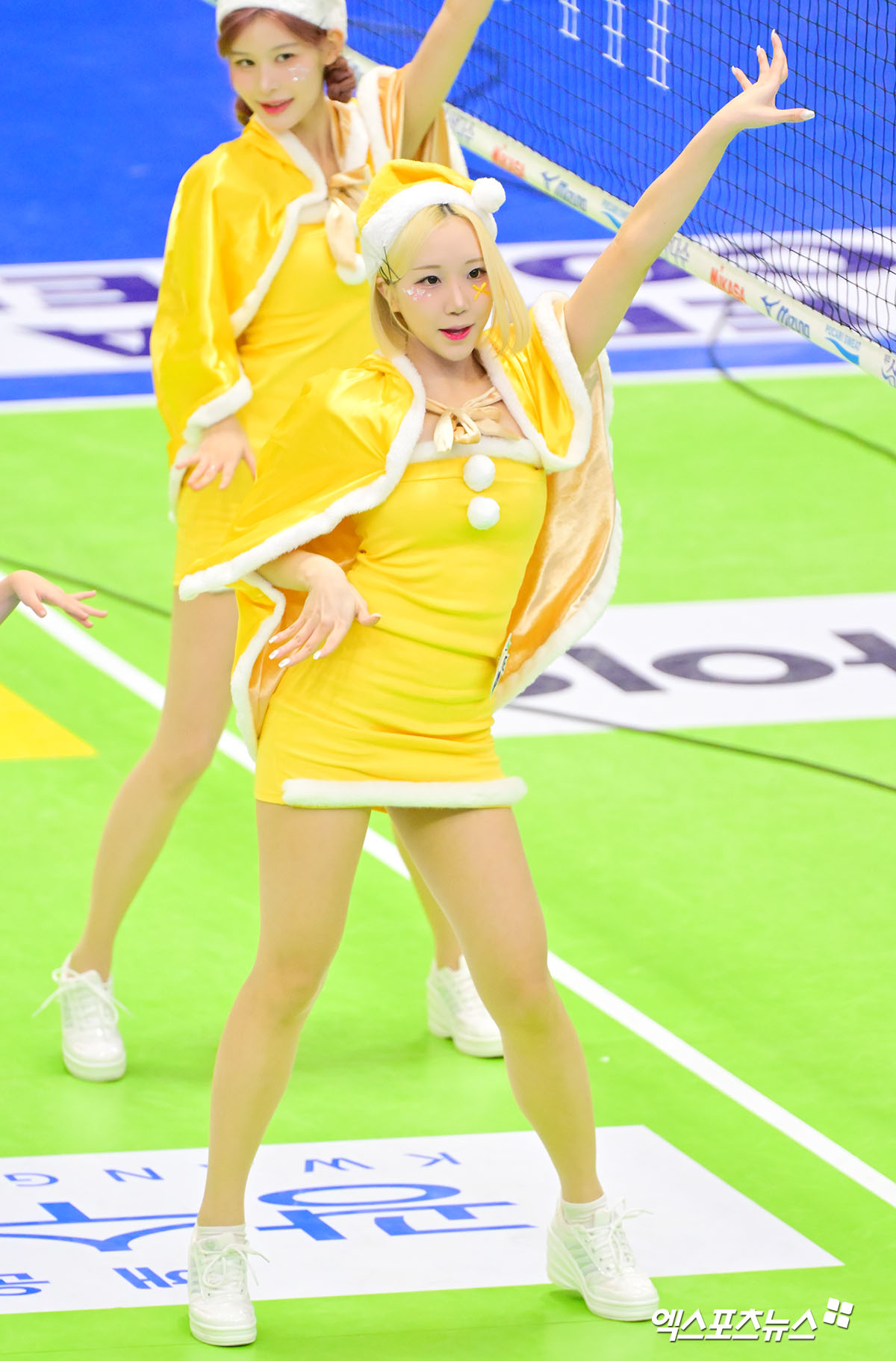 (엑스포츠뉴스 수원, 김한준 기자) 25일 오후 경기도 수원실내체육관에서 열린 '진에어 2025-2026 V-리그' 현대건설과 정관장의 경기, 박성은 치어리더가 멋진 공연을 선보이고 있다.