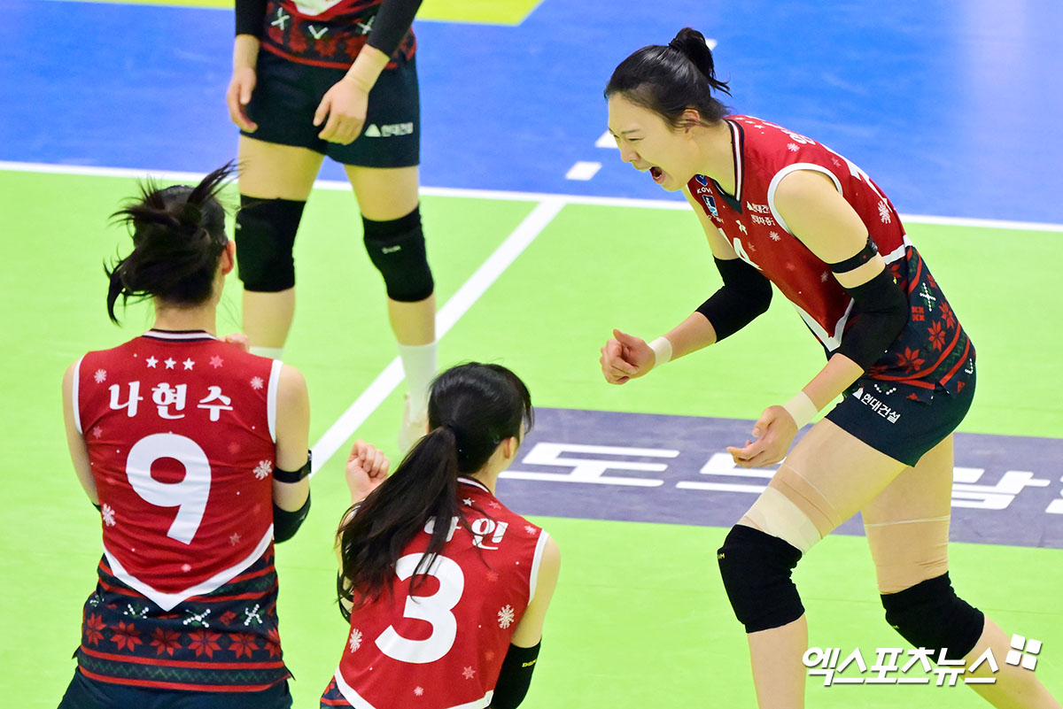 이날 경기에서 승리한 현대건설 선수들이 기뻐하고 있다.